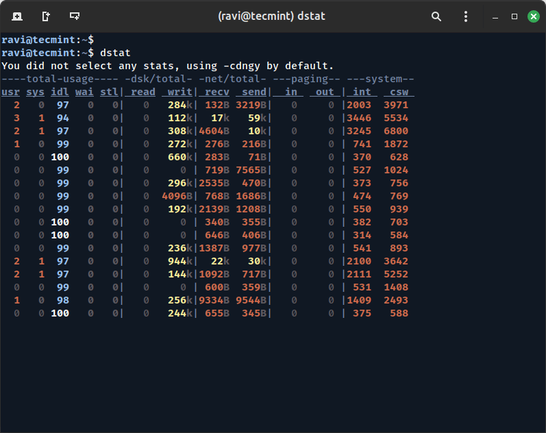 Once installed, you can start using dstat with a simple command: