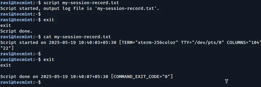 script my-session-record.txt Script started, file is my-session-record.txt exit Script done, file is my-session-record.txt