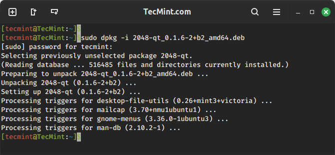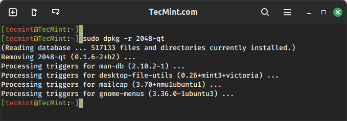 To remove the “.deb” package, we must specify the package name “2048-qt” with the “-r” option, which is used to remove/uninstall a package.
