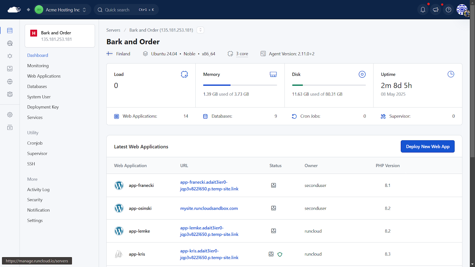 This approach differs from modern SaaS platforms such as RunCloud, which only installs a small agent on your server to manage it. This results in a lighter footprint on your server’s resources and a more streamlined dashboard, which allows you to deploy or delete server instances with only a few clicks.