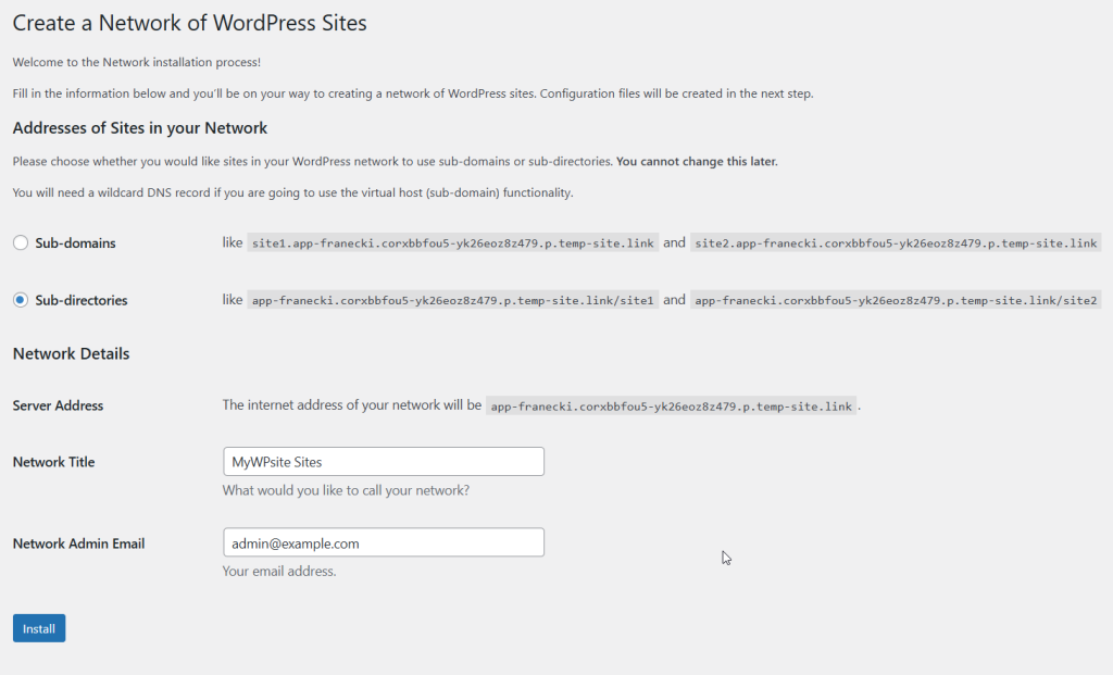 - Choose Your URL Structure: This is a very important step, so take a moment to think it through. WordPress will ask you to decide how the web addresses for your new sites will be formatted. You have two choices: Subdomains (which look like site1.yourdomain.com) or Subdirectories (which look like yourdomain.com/site1). This choice is permanent and difficult to change later, so pay close attention and choose the one that makes the most sense for your project’s future.