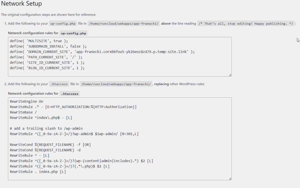 - Install the Network: After you’ve made your choice, simply follow the on-screen instructions provided by WordPress. It will generate two snippets of code for you to copy and paste. One snippet will go back into your wp-config.php file (the same one from Step 1), and the other will go into a file called .htaccess (a server configuration file in the same directory). Once you’ve carefully added the code and saved the files, your multisite network will be active and ready to go