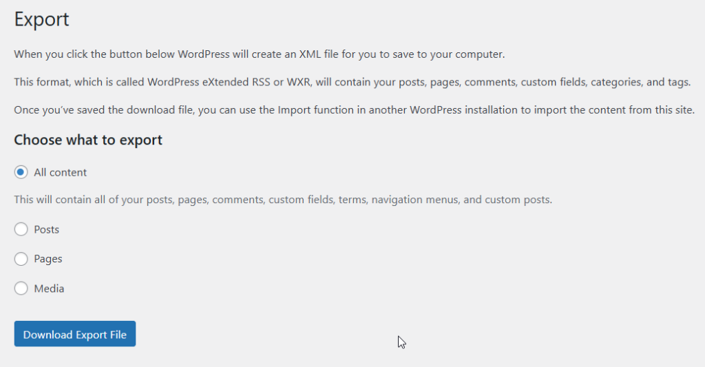- Select “All content” and download the XML (WXR) file. This file contains your posts, pages, comments, and other content.