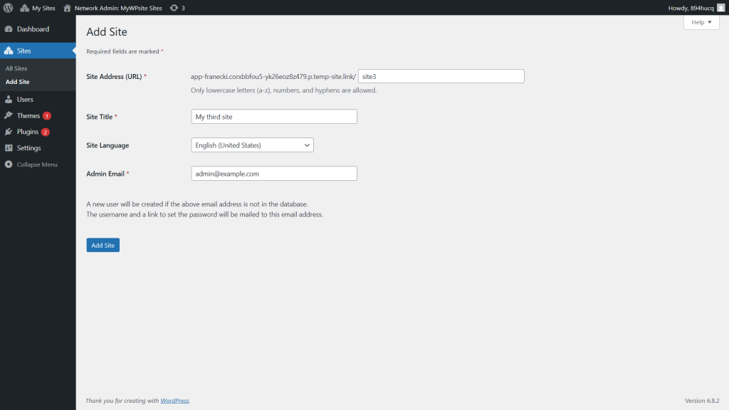 Next, you need to create a new site in your Multisite network. This is where you will import the data we exported in the previous step.