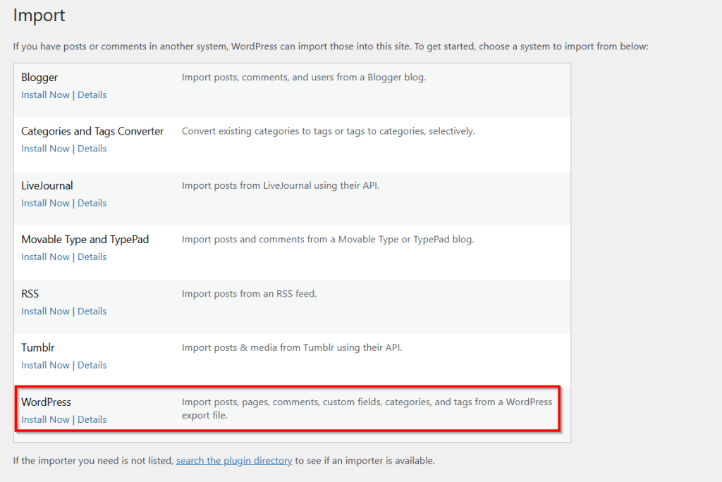 - Navigate to “Tools” -> “Import” and run the WordPress Importer.