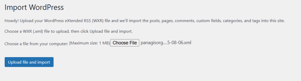 On the next screen, you must upload the XML file you exported in Step 1. Depending on the size of your site, you may run into issues with max_upload_size or PHP memory limits. You might need to contact your host to temporarily increase these.