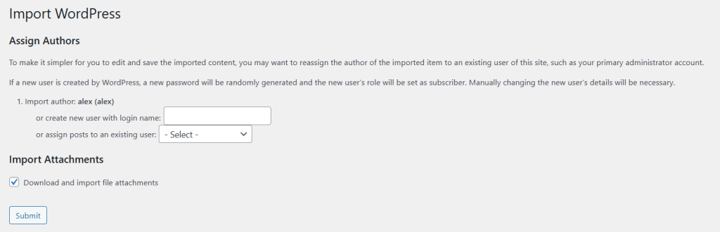- You will be prompted to assign the imported content to existing users or create new ones. Be sure to check the box to download and import file attachments. When you check this box, the WordPress Importer does two things: