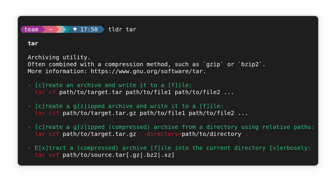 TLDR command working. Here, a cheat sheet for the tar command is shown using the syntax "tldr tar".