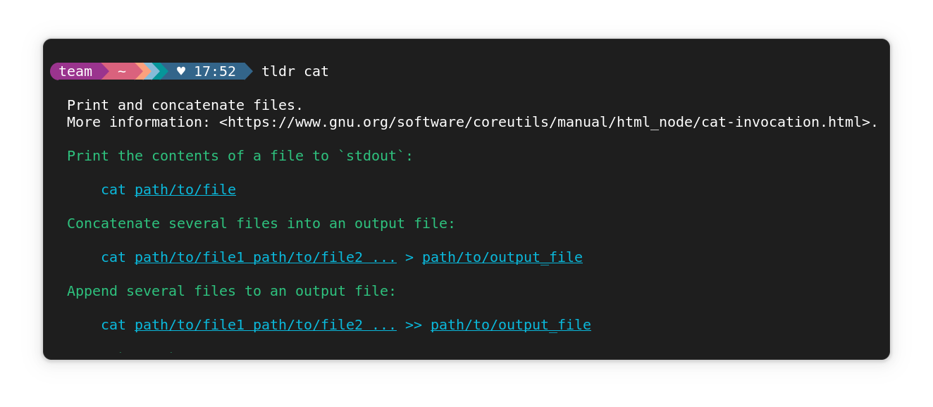 Tealdeer command working. Here, the tldr page of cat command is shown.