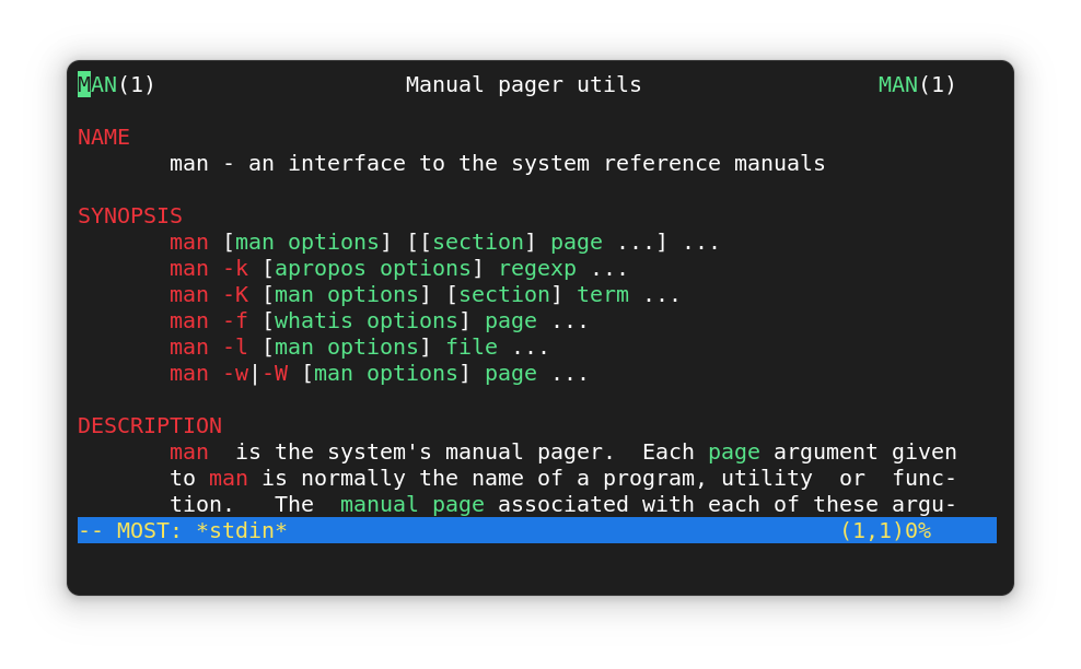 The man command output using Most pager. Colors will be applied to important parts of the man pages.