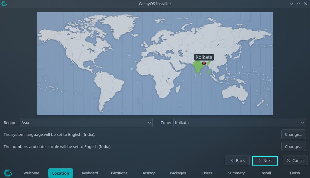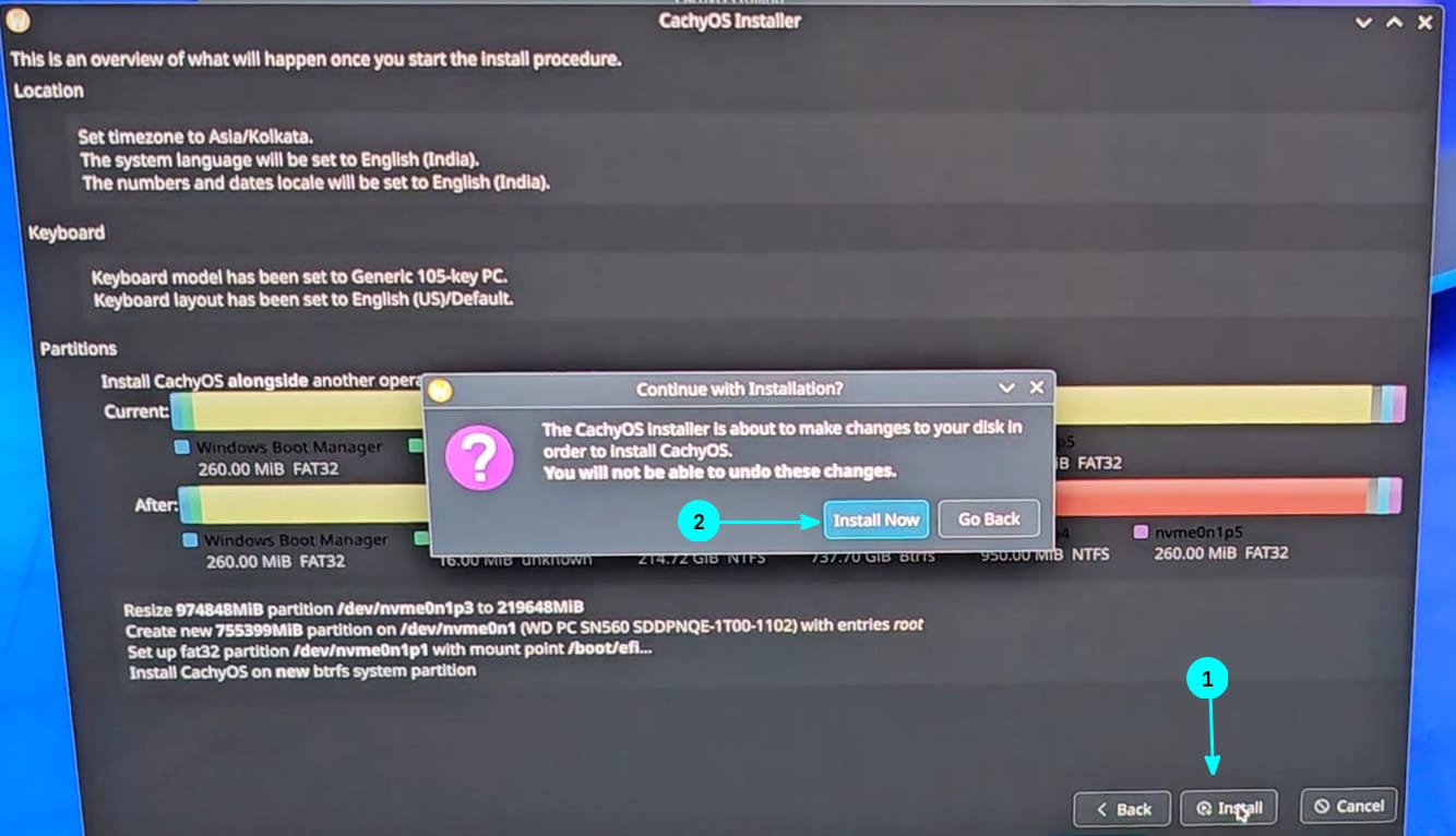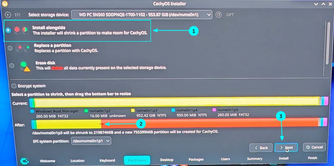 The most important step is the disk partition and I was pleasantly surprised to see that the Calamares installer detected Windows presence and gave option to install CachyOS alongside.