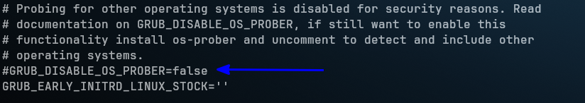 OS_PROBER was disabled, so I uncommented that line, saved the file and exited.