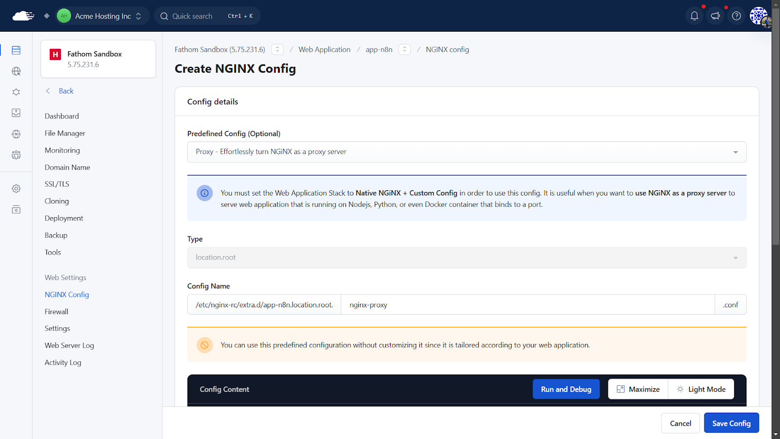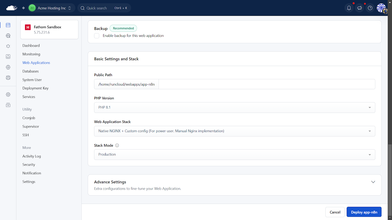 - Web Application Stack: For this setting, select “Native nginx + custom config” as we will be using this as a proxy to connect to the n8n Docker container.