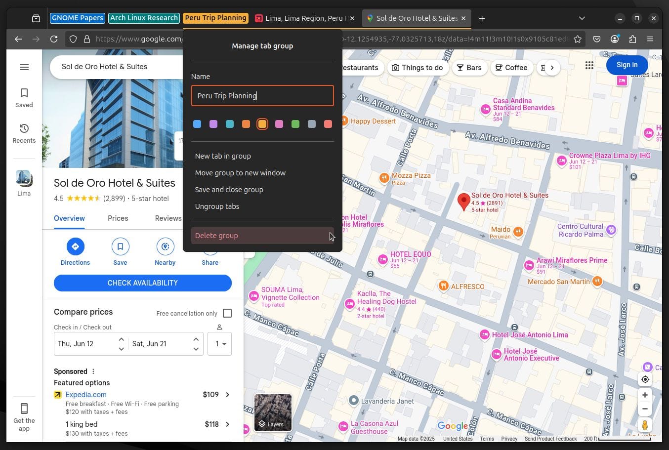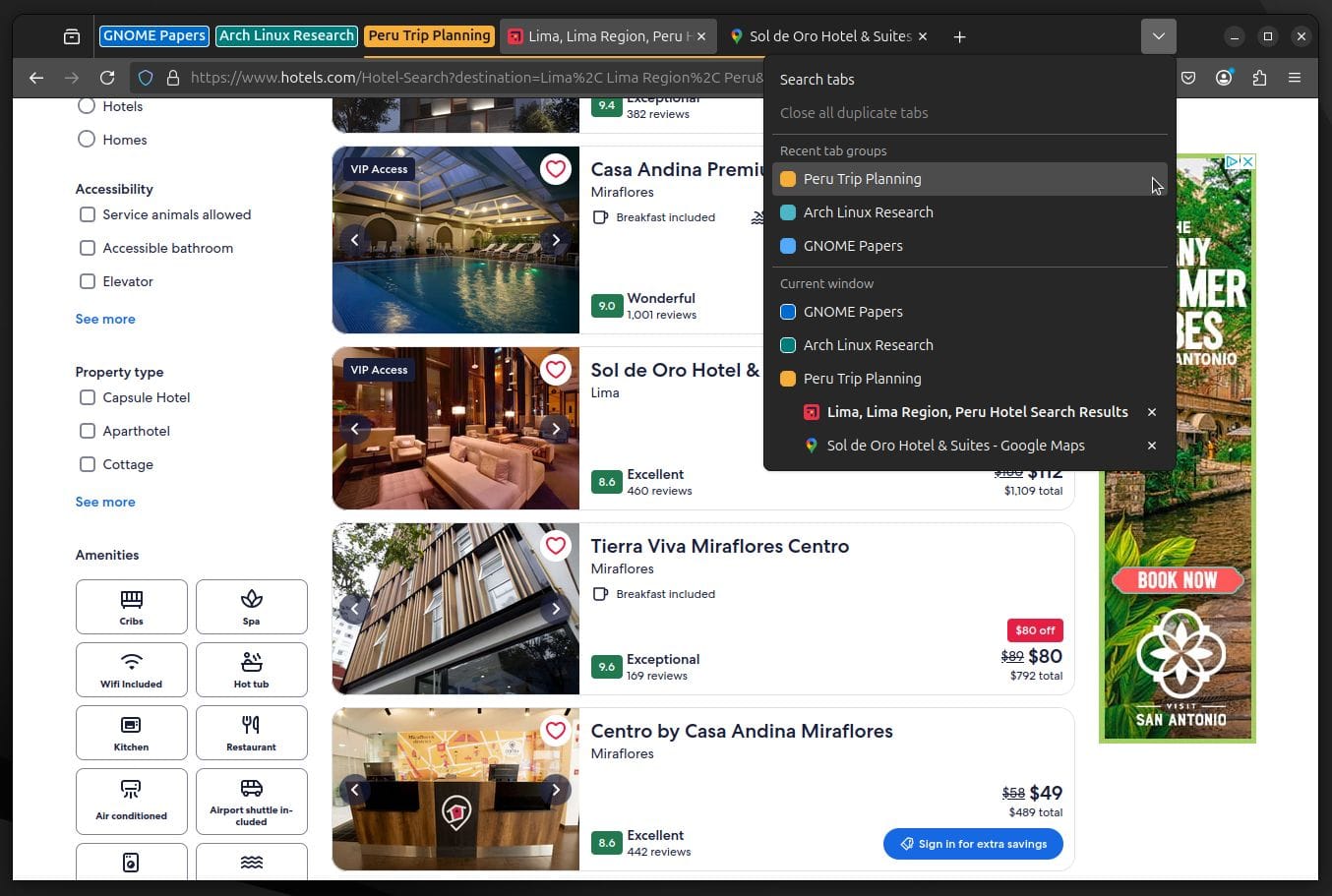 firefox tab groups list being shown with a hotels.com webpage for hotels in lima,peru being open in the background