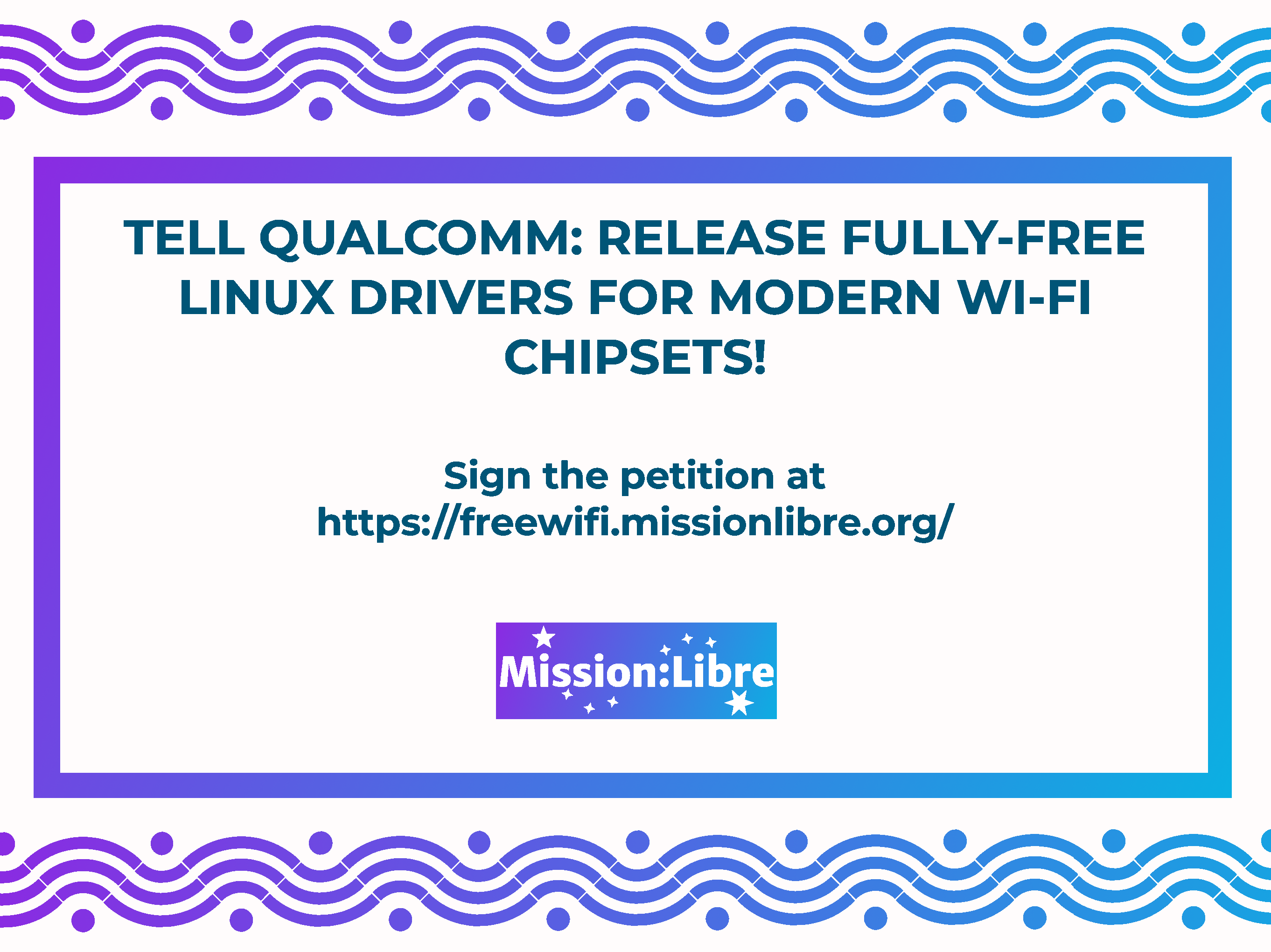 Carmen from Mission Libre has started a petition to get Qualcomm to release fully-free drivers for their in-production chipsets. If the petition is signed by 5,000 people, a hardcopy of the petition and signatures will be mailed to Qualcomm’s head office. We can get 5,000 signatures, can’t we?