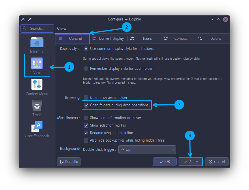 In the Dolphin file manager, you can open a folder while dragging a file to it. This is helpful if you want to drag and drop a file into a nested folder arrangement. To enable this, click on the Top-right Hamburger menu ⇾ Configure ⇾ Configure Dolphin.