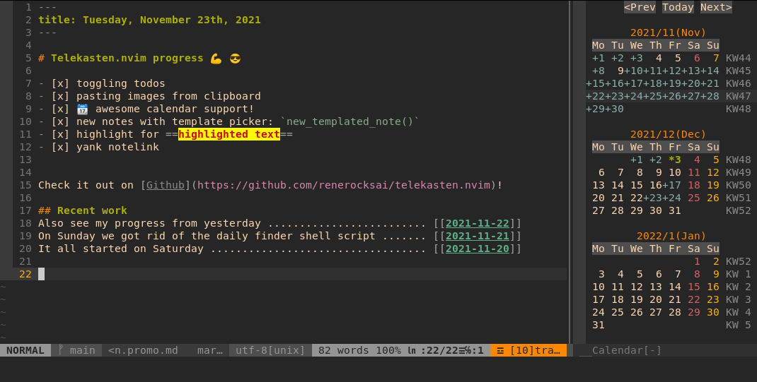 telekasten.nvim is a Neovim Lua plugin that lets you manage a markdown-based zettelkasten/wiki + journal inside Neovim.