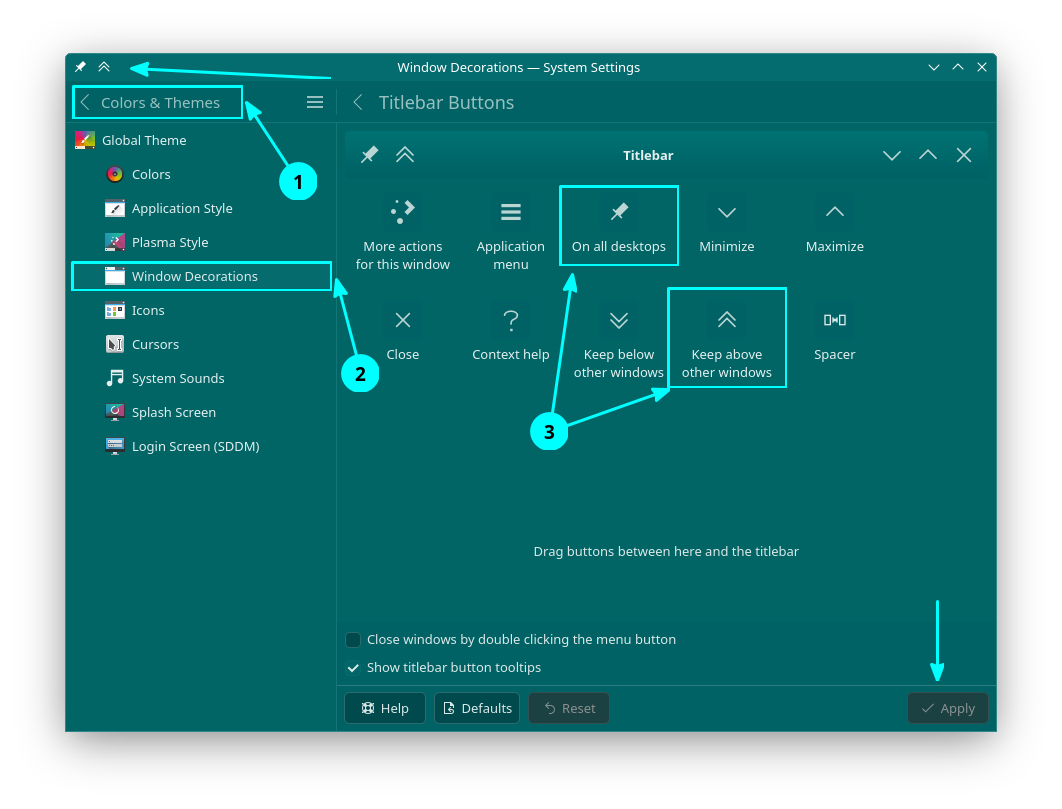 Here, add the “On all desktops” and “Keep above other windows” options to the title bar by dragging and dropping. Click on “Apply” to confirm the changes.