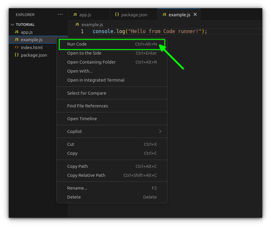 .jsfile, write some code, right-click, and select “Run Code.”