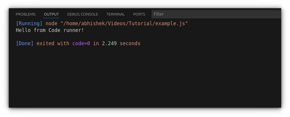 The output will appear immediately in the console, confirming that Node is executing your file properly.