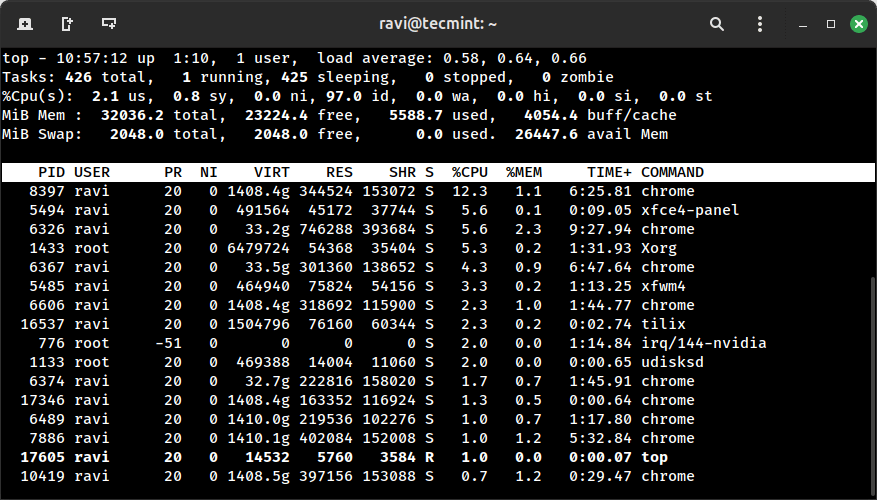 For a real-time view of what’s happening on your system, you can use top, which is included in almost every Linux distribution by default.