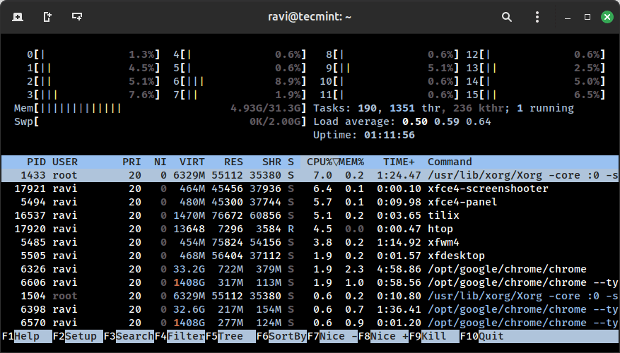 If you want something more user-friendly and colorful, try htop, which is a more advanced alternative to top. Unlike top, htop lets you scroll, filter, and sort processes easily using arrow keys and function keys.