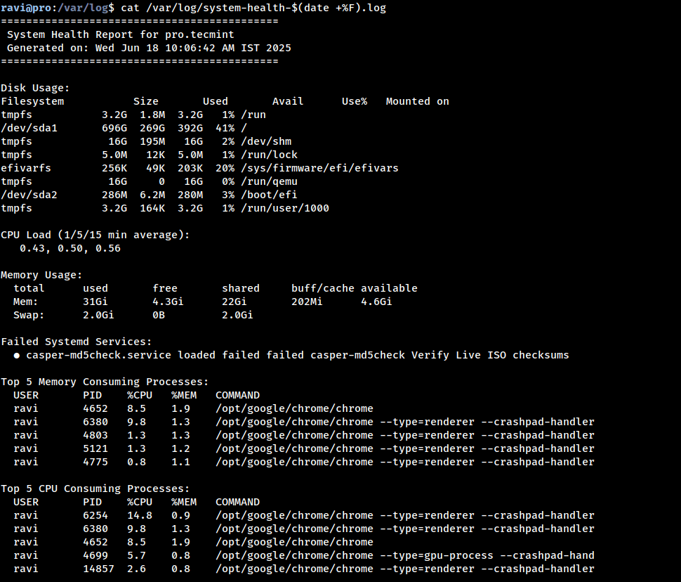 You should see a well-structured report with details about disk usage, CPU load, memory stats, failed services, and more.