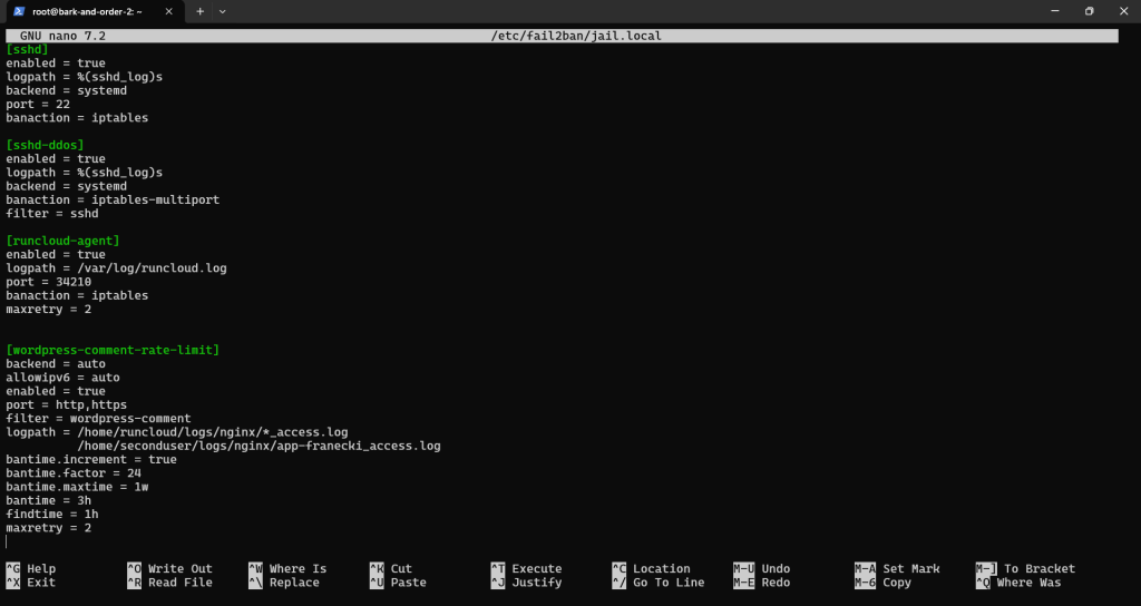 By setting maxretry = 5 and findtime = 1h, we are telling Fail2Ban: “If you see the same IP address making a sixth attempt (or more) to post a comment via wp-comments-post.php within any 60-minute window, block that IP address.” The first five attempts are allowed, but the sixth triggers the ban.