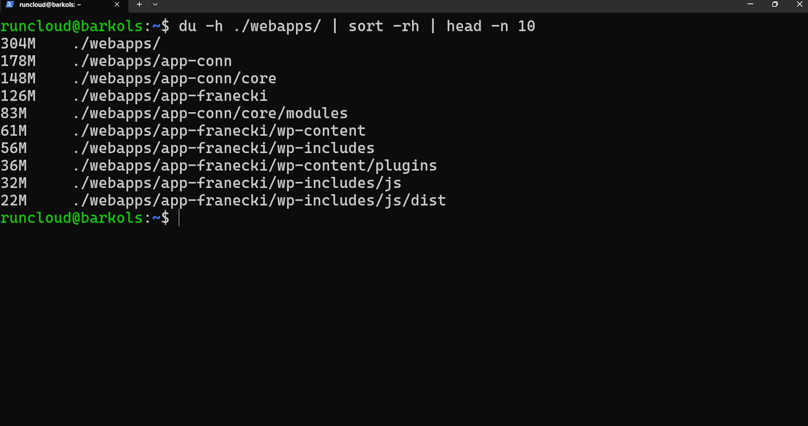 This is a favorite command of system administrators. It combines three tools to quickly pinpoint the biggest space hogs on your system. For example, if you want to check the ten biggest directories in the webapps directory, then you can run the following command: