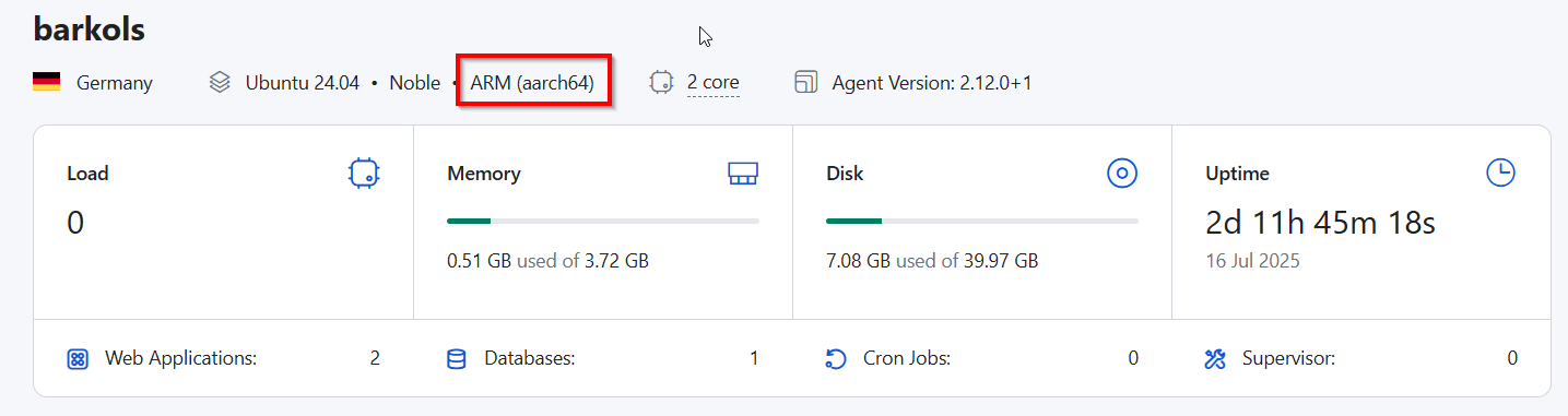 An output of aarch64 (or sometimes arm64) indicates that the server uses an ARM-based processor. Many people and cloud providers now choose ARM because these processors are designed to be extremely power-efficient. This efficiency means they consume less electricity to perform their tasks, directly translating into lower operational and hosting costs.