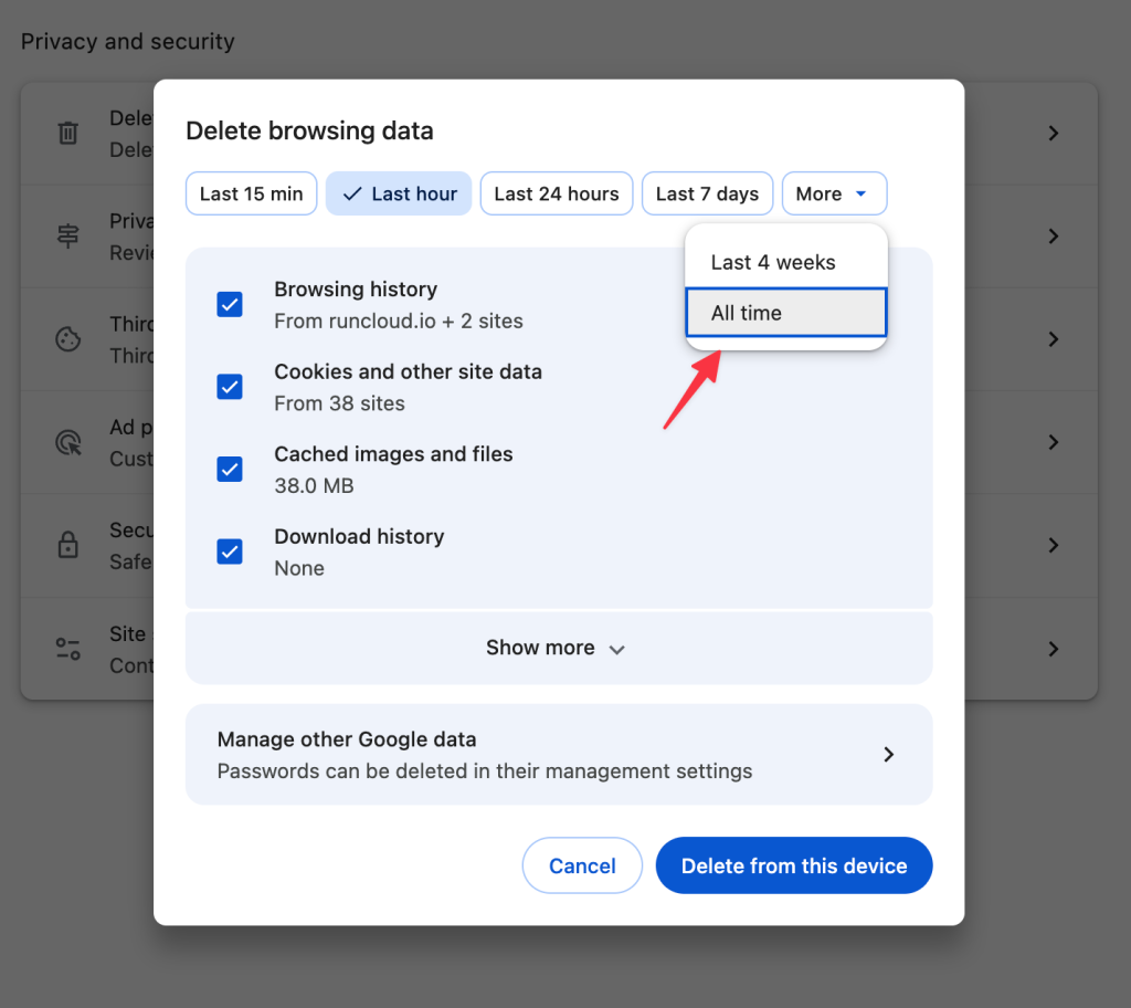 - Checkboxes: Ensure “Cookies and other site data” and “Cached images and files” are selected.