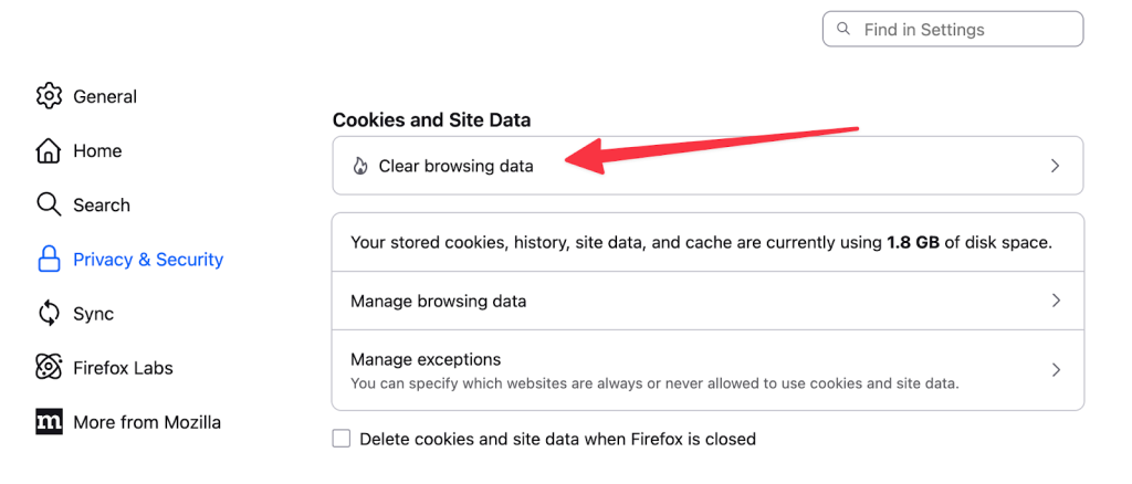 - Privacy & Security: On the left sidebar, click Privacy & Security. Find the section labeled Cookies and Site Data and click the Clear Browsing Data button.