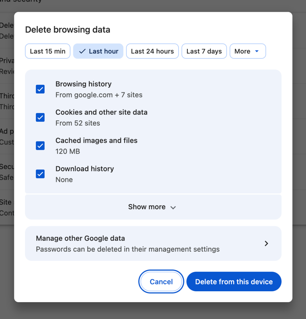 - Checkboxes: Ensure “Cookies and other site data” and “Cached images and files” are selected.