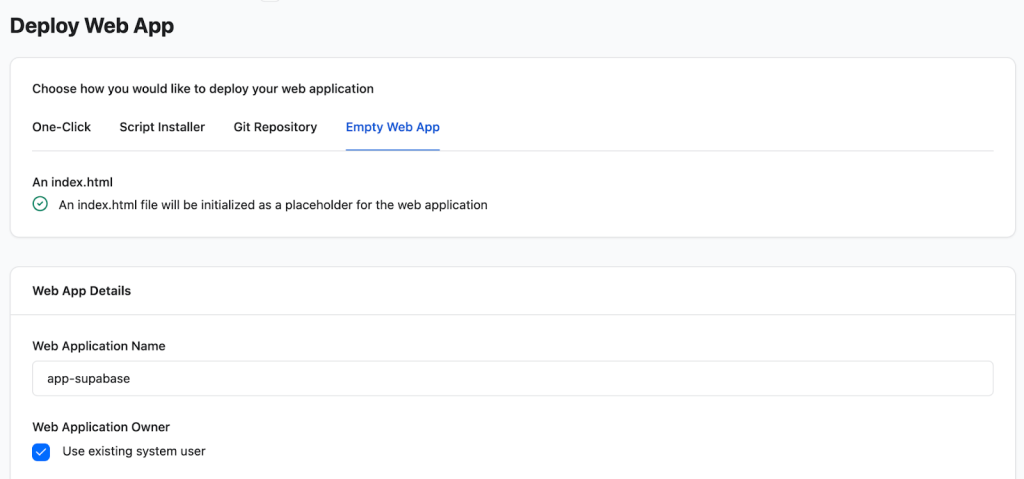 Next, we need to create a “container” or placeholder within RunCloud for our Supabase installation. This web application will define the directory structure and the domain that will point to our Supabase instance.