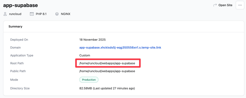 - Note down the Project Root: After the application is created, take note of the Web Root Path, which is displayed on the dashboard. This will be something like /home/runcloud/webapps/app-supabase. You will need this exact path in a later step.