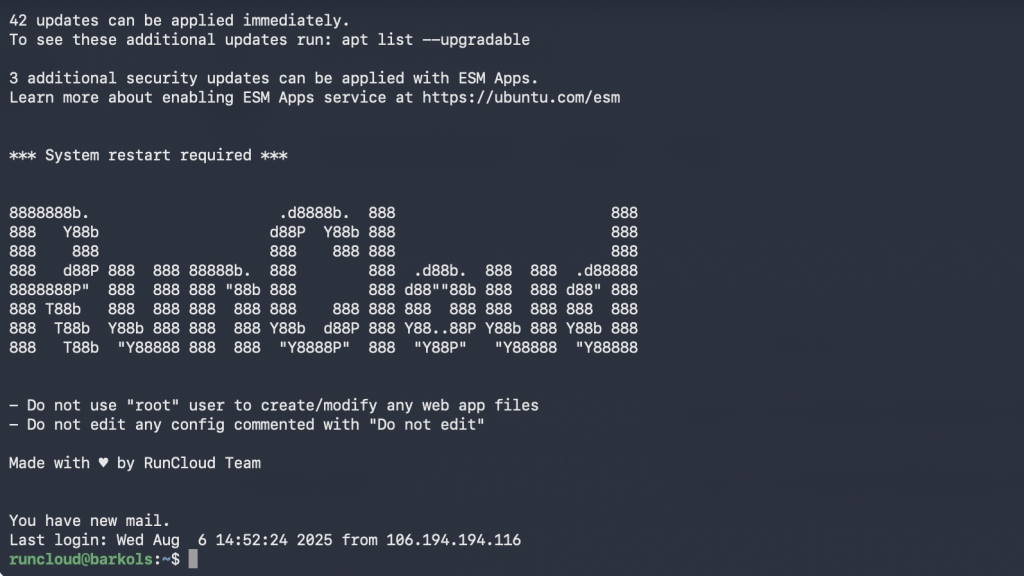 ssh-i ~/.ssh/your_private_key runcloud@<YOUR_SERVER_IP>