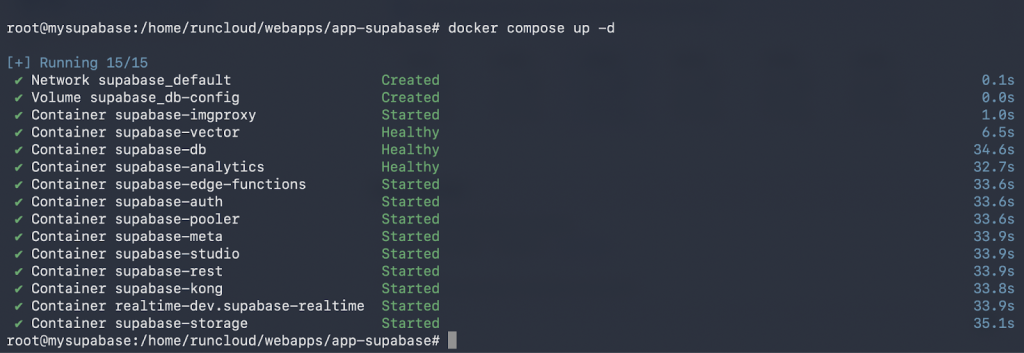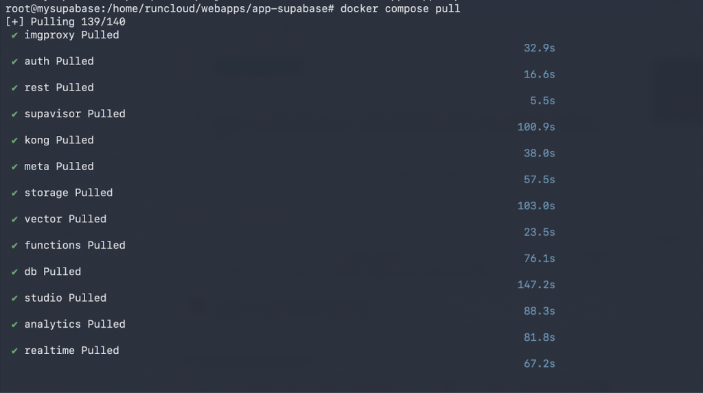 This command downloads all the necessary container images for each Supabase service (database, auth, storage, etc.). This may take several minutes, depending on your server’s network speed.