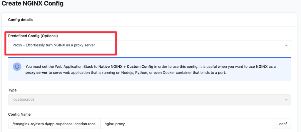 - From the “Predefined Config” dropdown, select “Proxy – Effortlessly turn NGINX…”