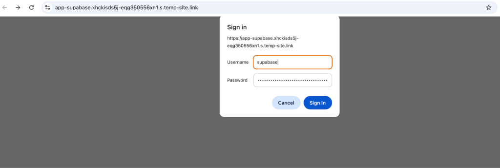 Your self-hosted Supabase instance is fully deployed and accessible on the internet. You can now open your web browser and navigate to the domain you configured in Step 2 (e.g., https://supabase.yourdomain.com). When you visit this site, you should see the Supabase Studio login screen.