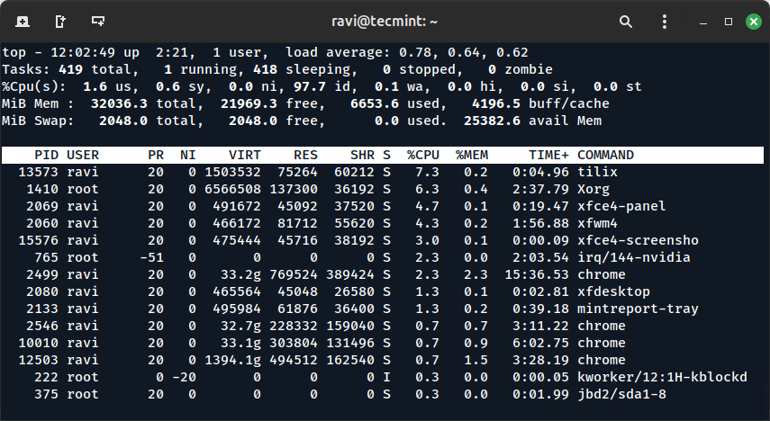 Using top command, which will provide a real-time interactive view of running processes:
