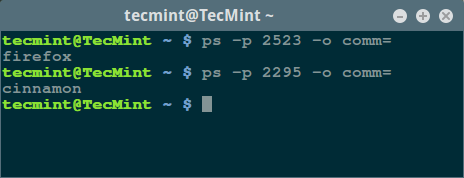 Coming back to our point of focus, assuming you already know the PID of a process, you can print its name using the command form below: