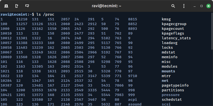 ls /proc OR ls /proc | less