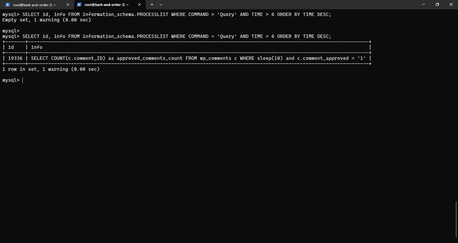 SELECT id, info FROM information_schema.PROCESSLIST