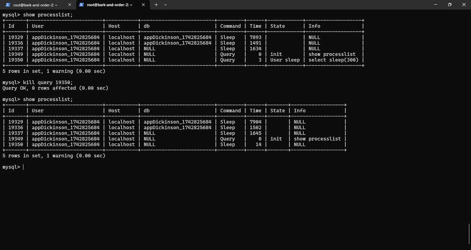⚠️ Warning: Always double-check that you are using the correct process ID obtained from SHOW PROCESSLIST before executing any KILL command. Terminating the wrong process can lead to unexpected application errors or data inconsistencies.