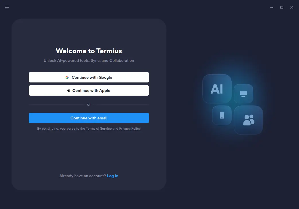 On first launch, you may be prompted to sign in or create a Termius account. While an account is optional, it enables features like cloud sync and encrypted vaults.