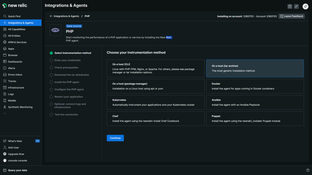 After logging in to your New Relic account and selecting “Integrations & Agents” > “Data source”, you will be prompted to choose your data collection method. To monitor your RunCloud servers, select the “On a host (tar archive)” button. This is a generic installation that is highly compatible with various server setups.