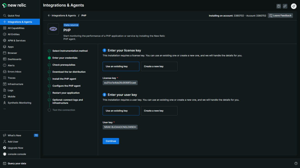 You will need to provide your New Relic license key and user key. These keys link the monitoring agent to your account. Enter the required keys in the respective fields to proceed. If you don’t have the keys, click the “Create a new key” button.