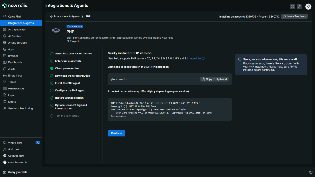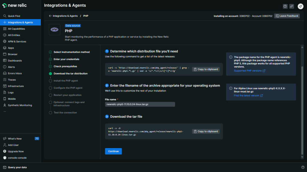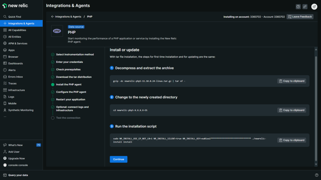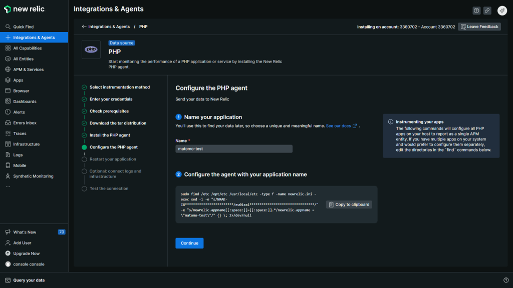 - Configure the agent: Run the provided newrelic-install script with your application name. This command will configure all PHP apps on your host to report to a single APM entity unless you configure them separately.