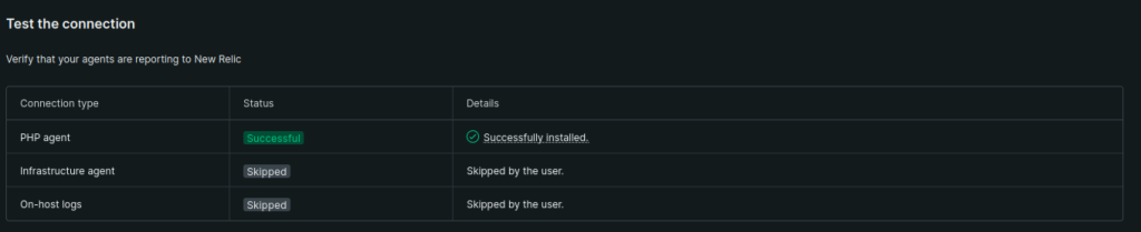 After completing all the installation steps, you can use the “Test connection” feature in the New Relic setup guide. The PHP agent’s “Successful” status confirms that it is properly configured and will report data to your account.