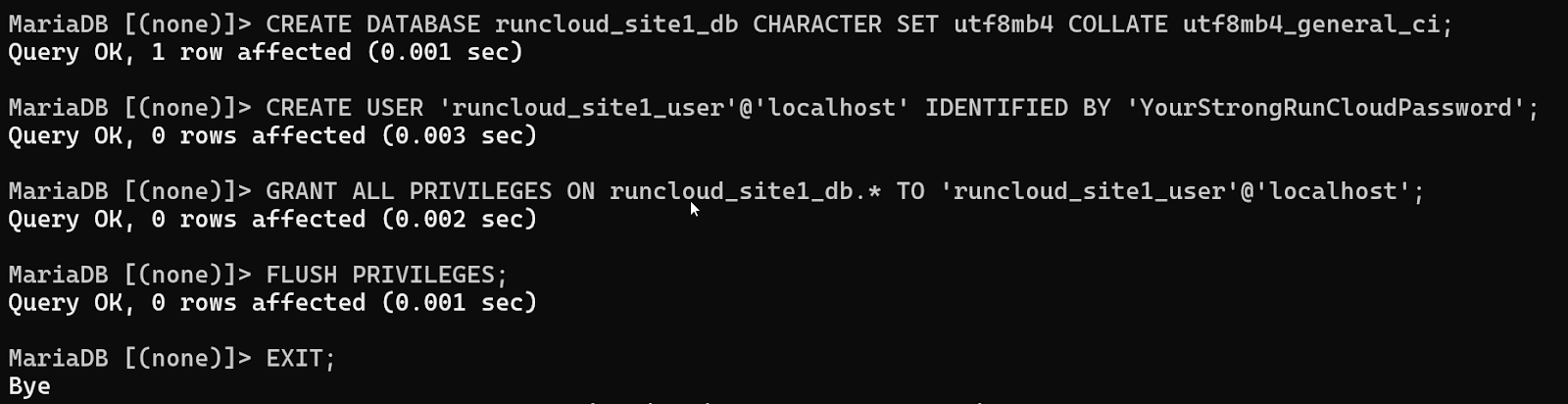 CREATE USER 'runcloud_site1_user'@'localhost' IDENTIFIED BY 'YourStrongRunCloudPassword';